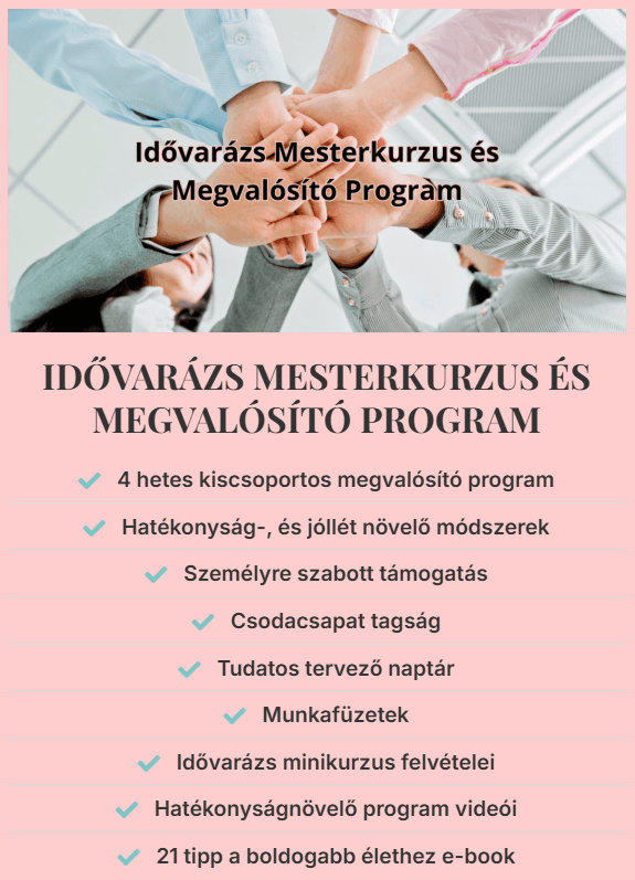 Az Idővarázs Mesterkurzus és Megvalósító Program, azaz az IMMP egy 4 hetes rendszerkialakító kiscsoportos program ÉNidő fókusszal, ami 2025.05.19-én indul. A program célja, hogy támogasson téged egy tudatosabb és kiegyensúlyozottabb élet megteremtésében.